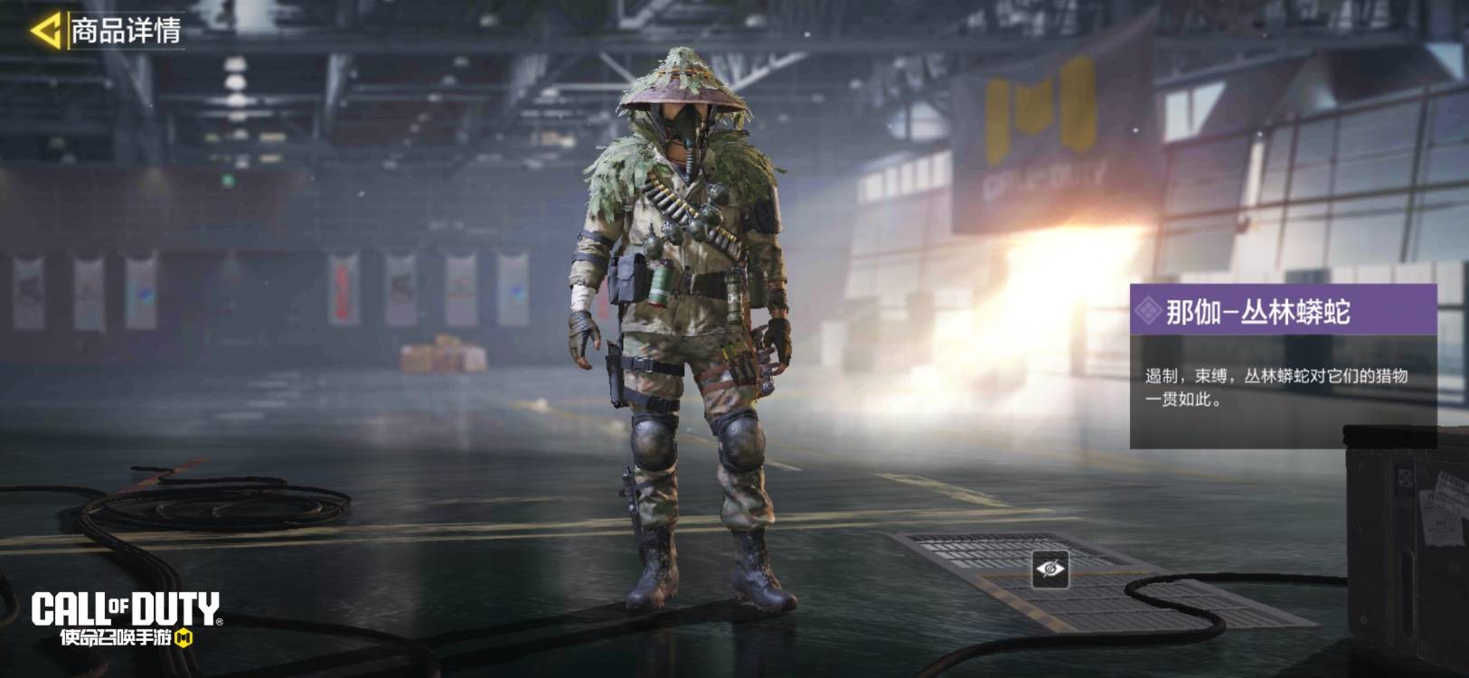 遏制,束缚,丛林蟒蛇对它们的猎物一贯如此。为了在战斗中很好的伪装自己,那伽-丛林蟒蛇穿上与灌木相近的迷彩服,并在关键部位处粘上树叶伪装。他对每次任务都做足万全准备,力求完美完成任务。