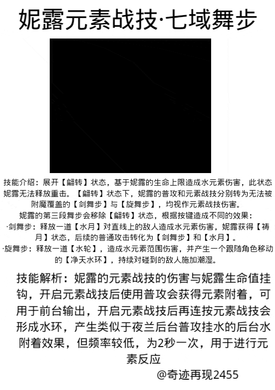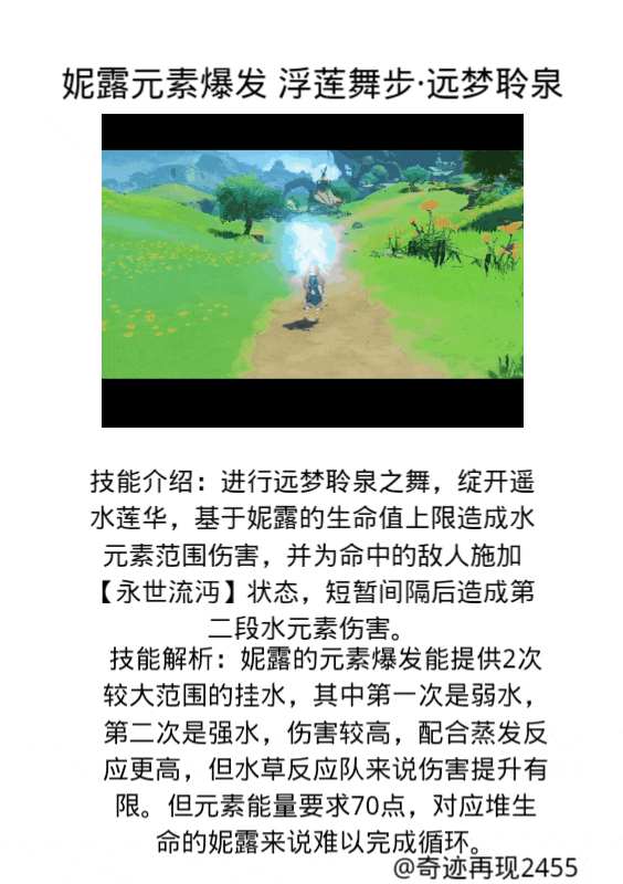 技能展示:技能解析:妮露的元素爆发能提供2次较大范围的挂水,其中第一次是弱水,第二次是强水,伤害较高,配合蒸发反应更高,但水草反应队来说伤害提升有限。但元素能量要求70点,对应堆生命的妮露来说难以完成循环。
