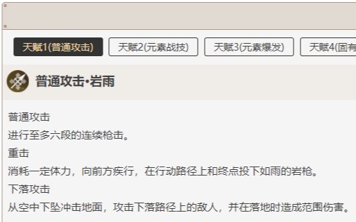 从空中下坠冲击地面,攻击下落路径上的敌人,并在落地时造成范围伤害。(全提瓦特最低的普攻倍率,除非你想拿他打主c,否则不建议用普攻输出)