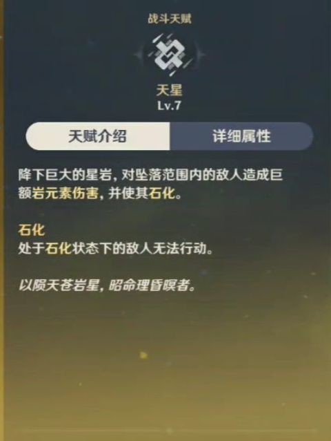 降下巨大的星岩,对坠落范围内的敌人造成巨额岩元素伤害,并使其石化。