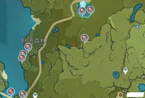 2、鸡腿位置二:低语森林-星落湖(16个)。
