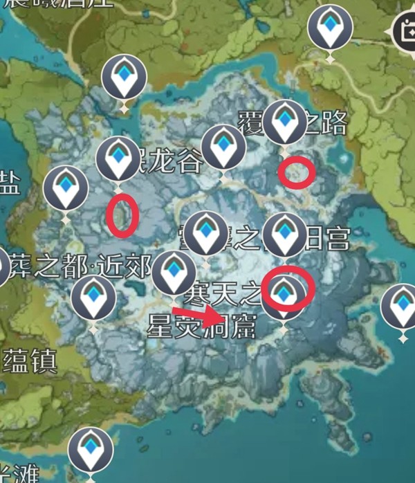 2.右上圈为楼主图示丘丘冰凯王的位置,需要在这附近找四颗绯红之石破盾(用完一个就会冰冻一个,直到解冻碎片。联机状态下一颗可以被多捡)。