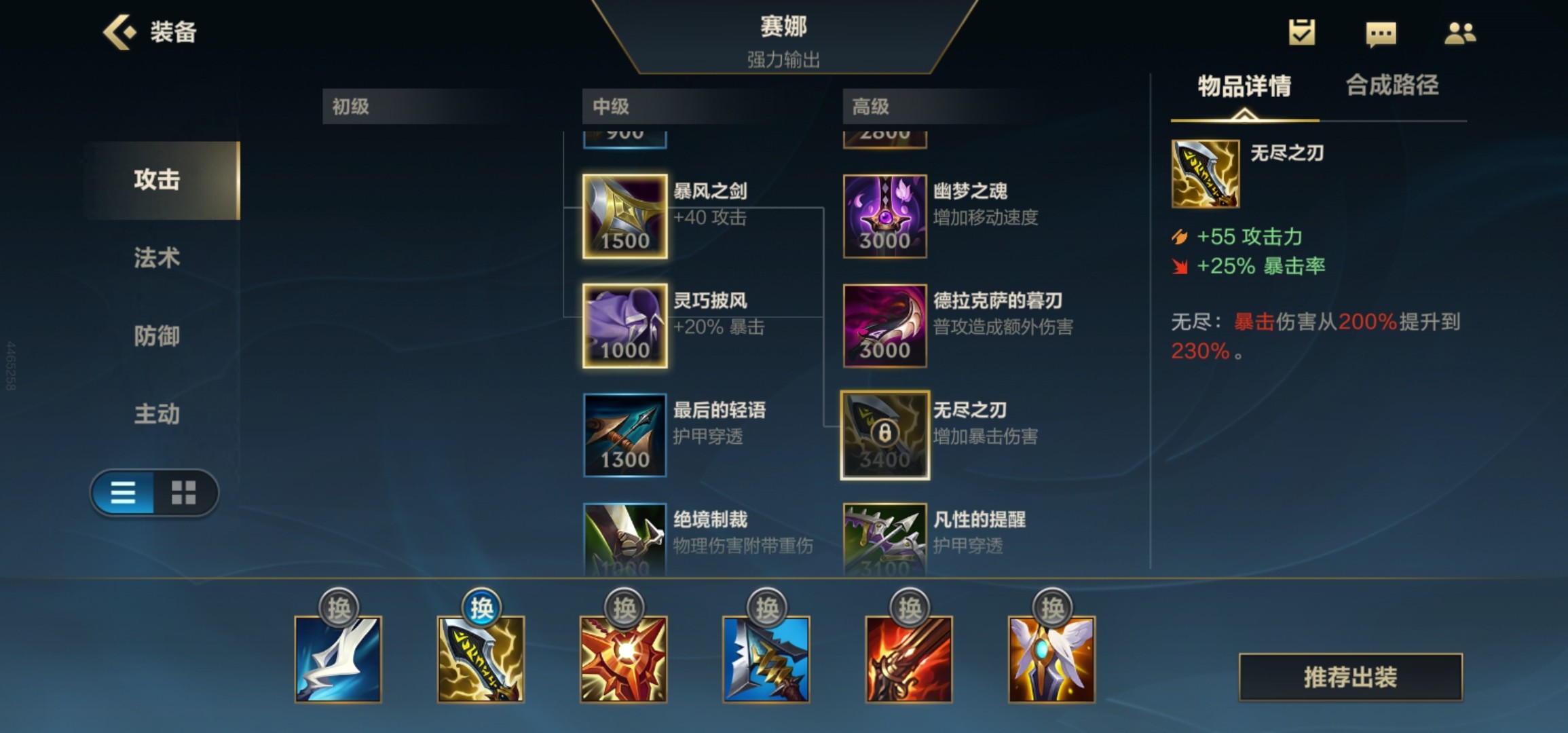 塞纳由于会自己获得暴击,所以装备上不需要像其他AD一样刻意叠暴击,推荐魔宗、无尽之刃、疾射火炮、赛瑞尔达的怨恨和守护天使。