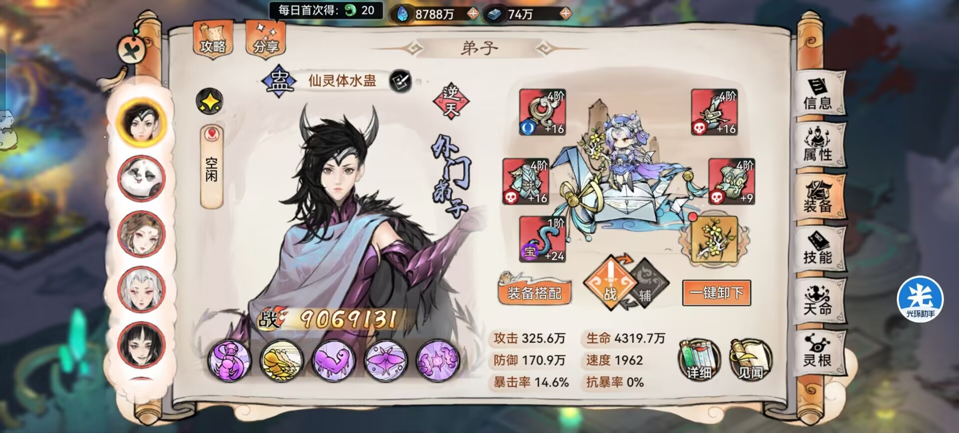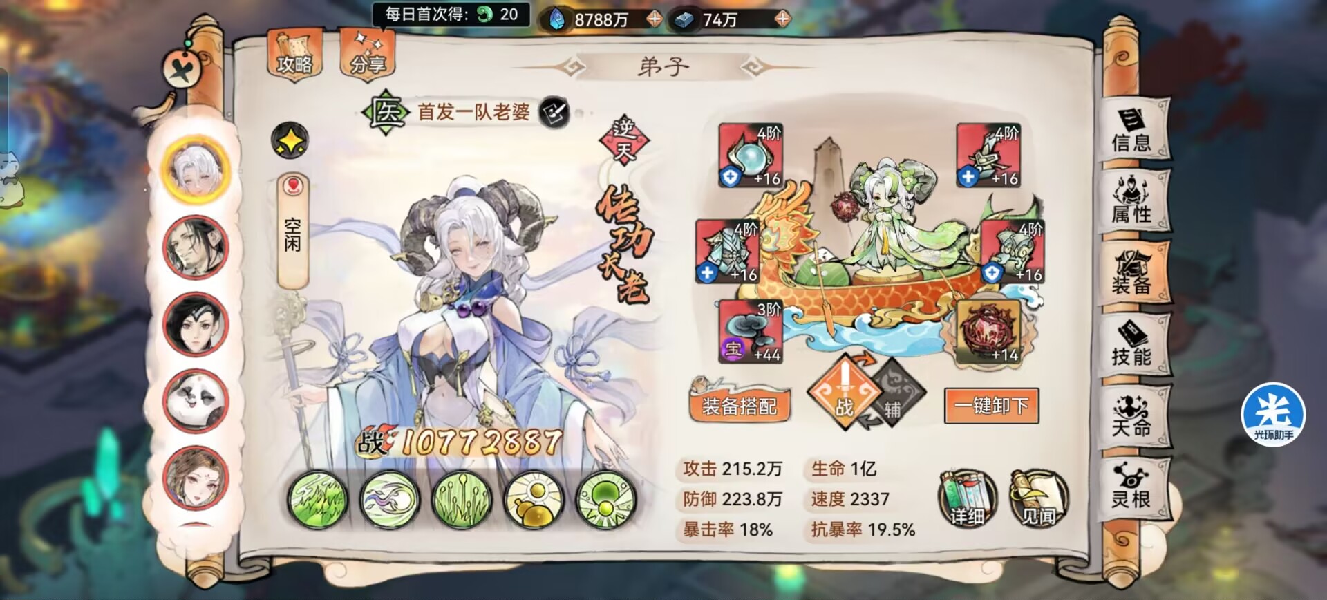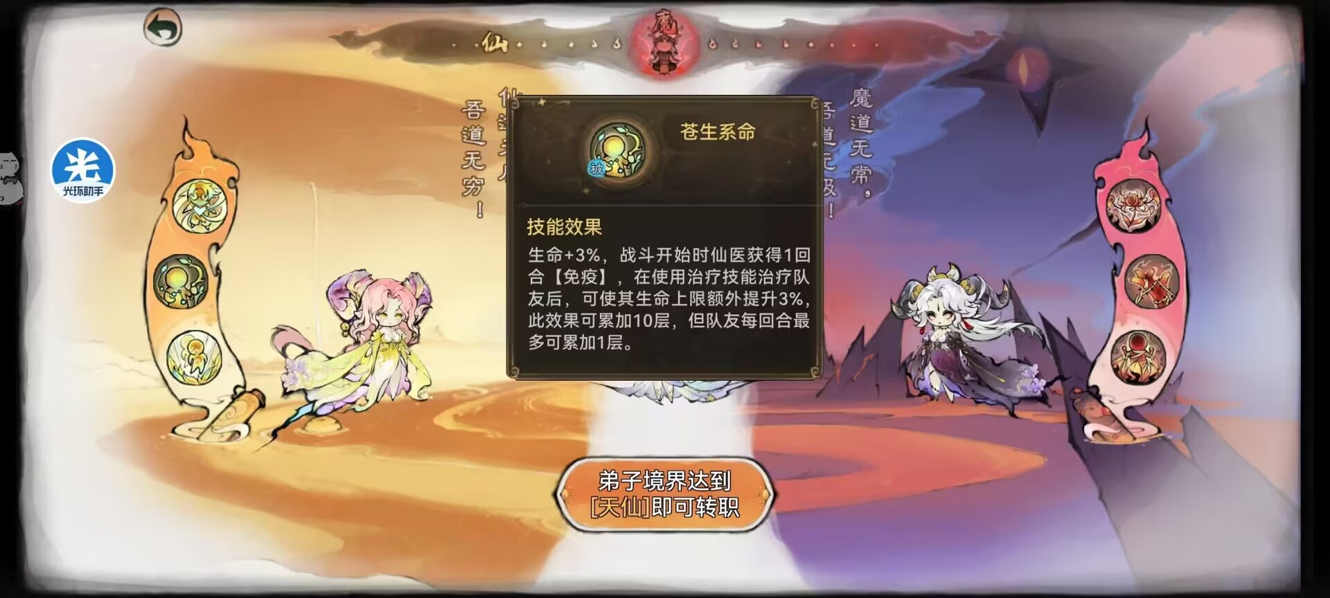 战斗开始仙医可以获得1回合免疫,使用治疗技能治疗队友后,可以给队友的生命上限额外增加3%,效果可以叠加10层!每回合只能帮队友添加1层。