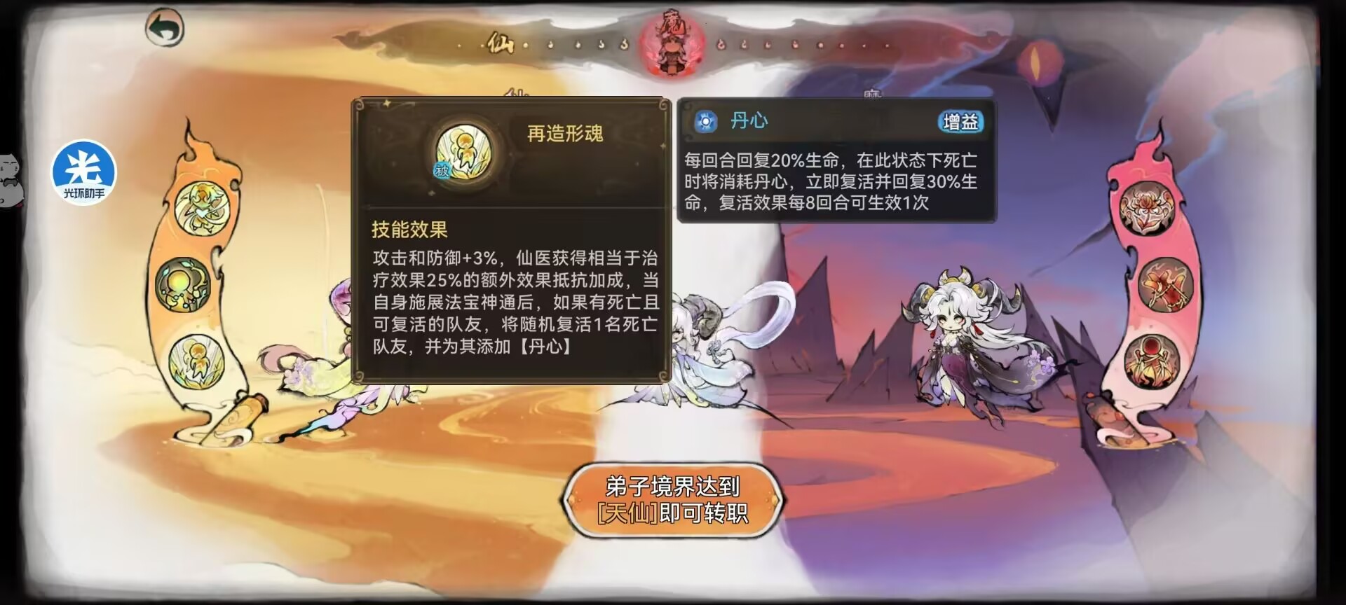 仙医获得治疗效果25%的抵抗加成,自身释放法宝神通后,如果有死亡可复活的队友,将随机复活1名队友,并给它一枚丹心。